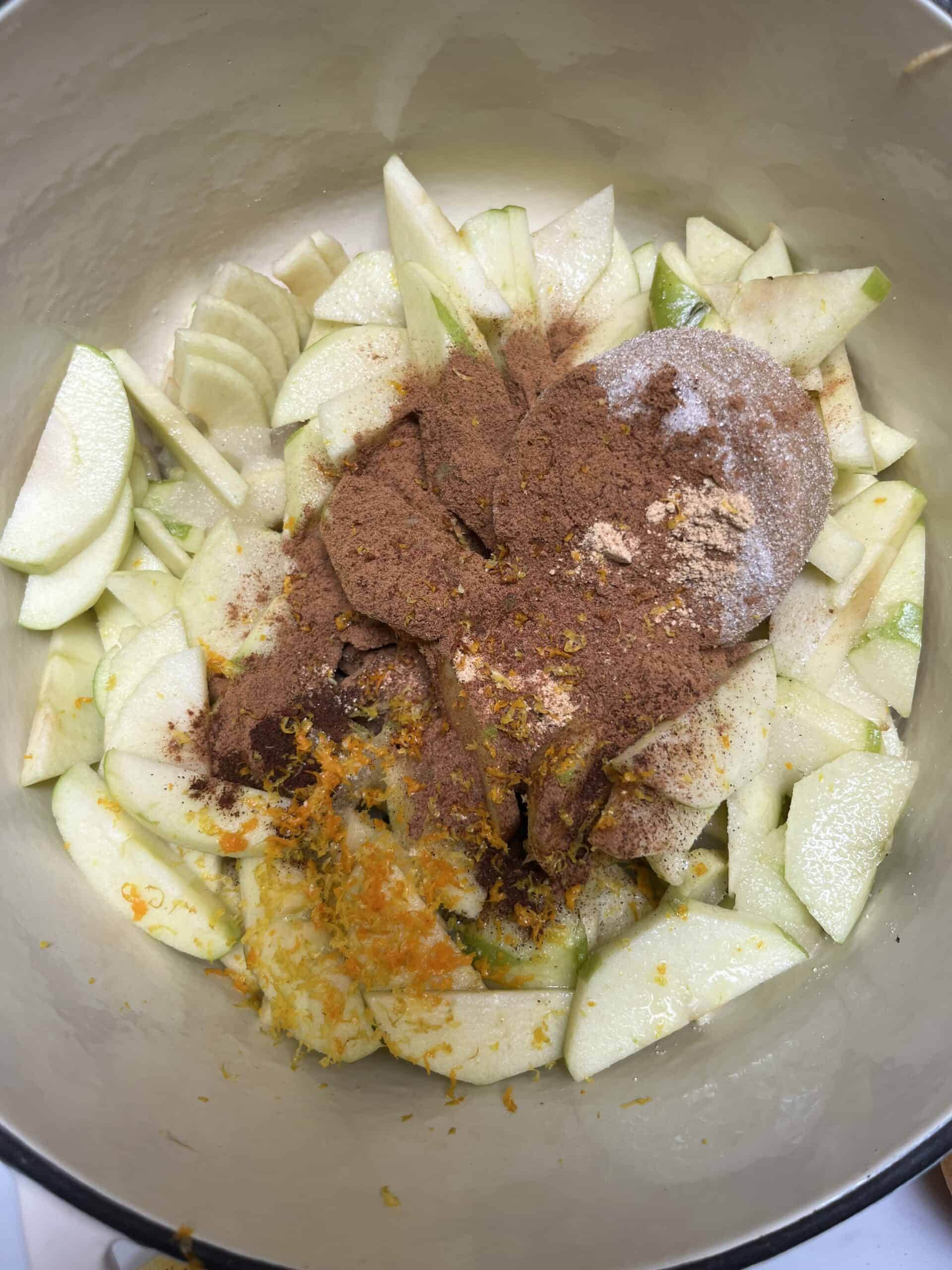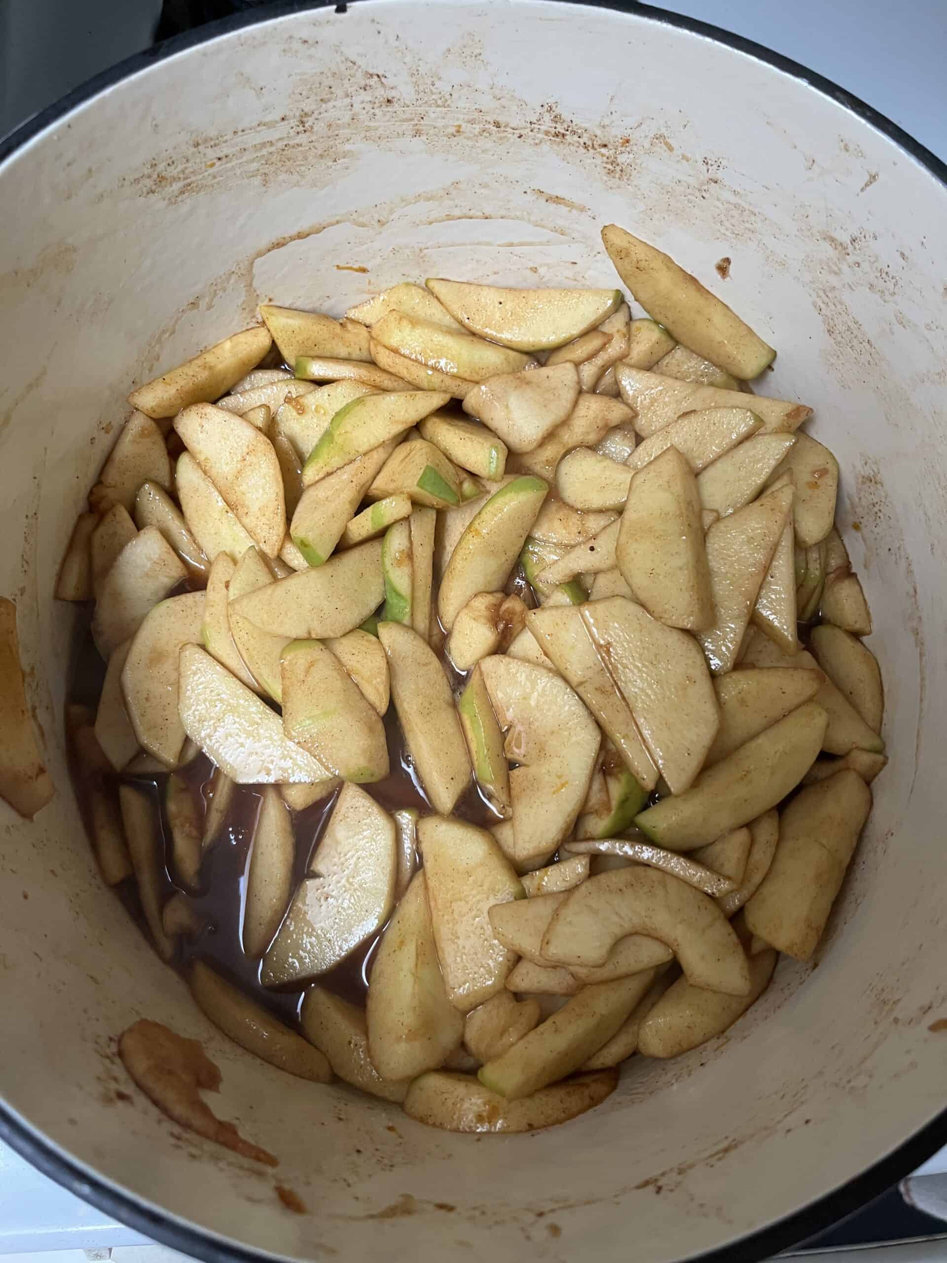 - Step 1: Slice apples and then add all of the fulling ingredients except the flour.