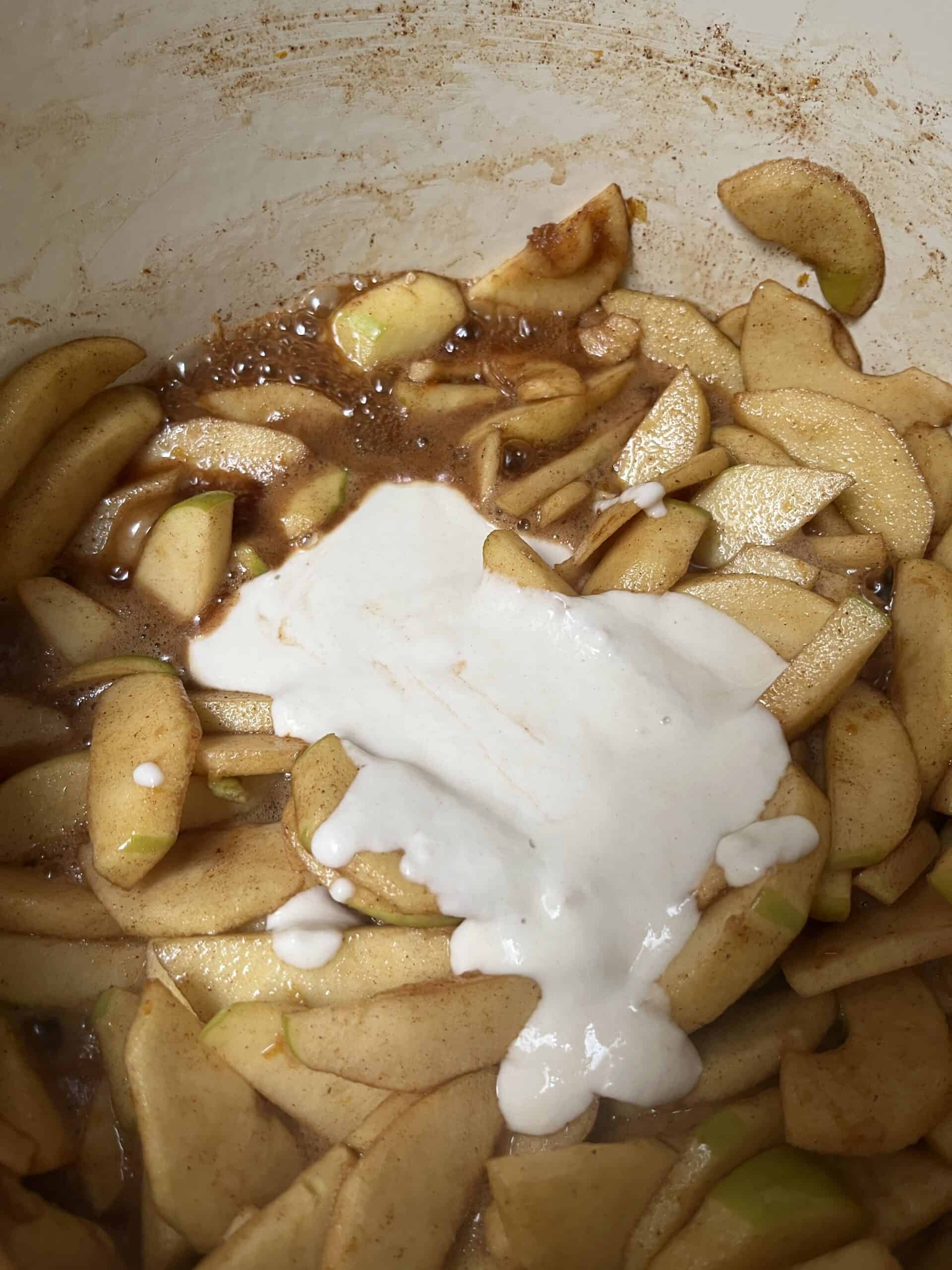 - Transfer the apples and any juices to a saucepan over medium heat and cook until slightly tender, about 5-7 minutes. Mix the flour with a splash of water to make a slurry, then stir it into the apples. Cook just until the filling thickens slightly and coats the back of a spoon. Stir in butter for richness, then let the filling cool completely before adding it to the crust.